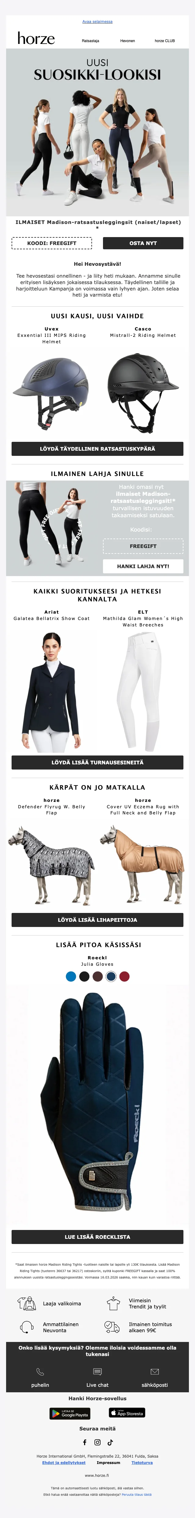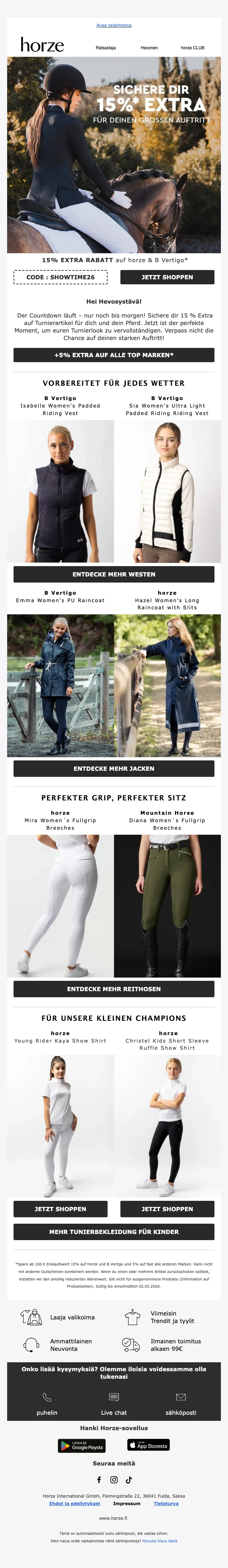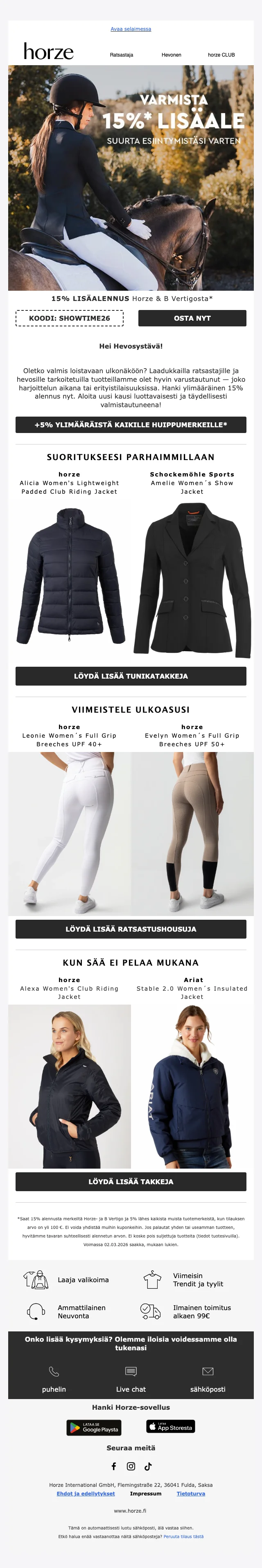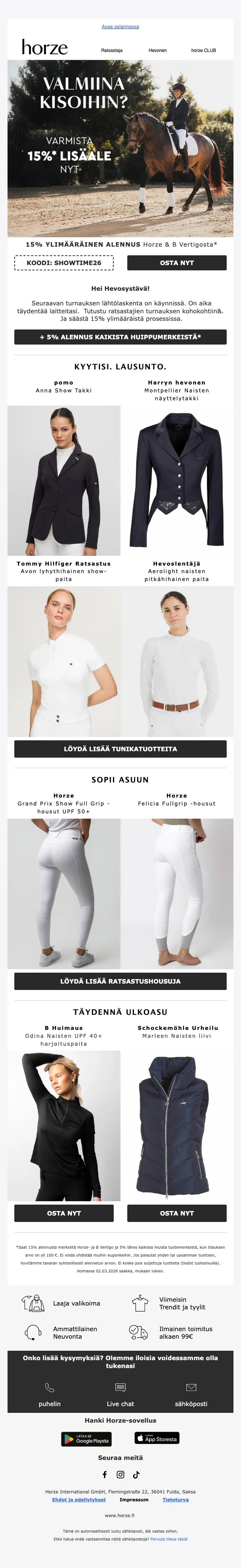 Verkkokaupan sivuilta löydät ajankohtaisimmat alennuskoodit, loistavat tarjoukset ja huikeat erikoiskampanjat sekä uutuustuotteista, että valikoimasta poistuvista tuotteista. Hyödynnä upea Horze alennuskoodi tai ainutlaatuinen tarjous ja takaat varmasti ratsastushousut, ratsastuskypärän tai hevostarvikkeet todella edullisin hinnoin. Uutiskirjeen tilaajat saavat lisäksi kaikki alekoodit ja tarjoukset suoraan sähköpostiin.