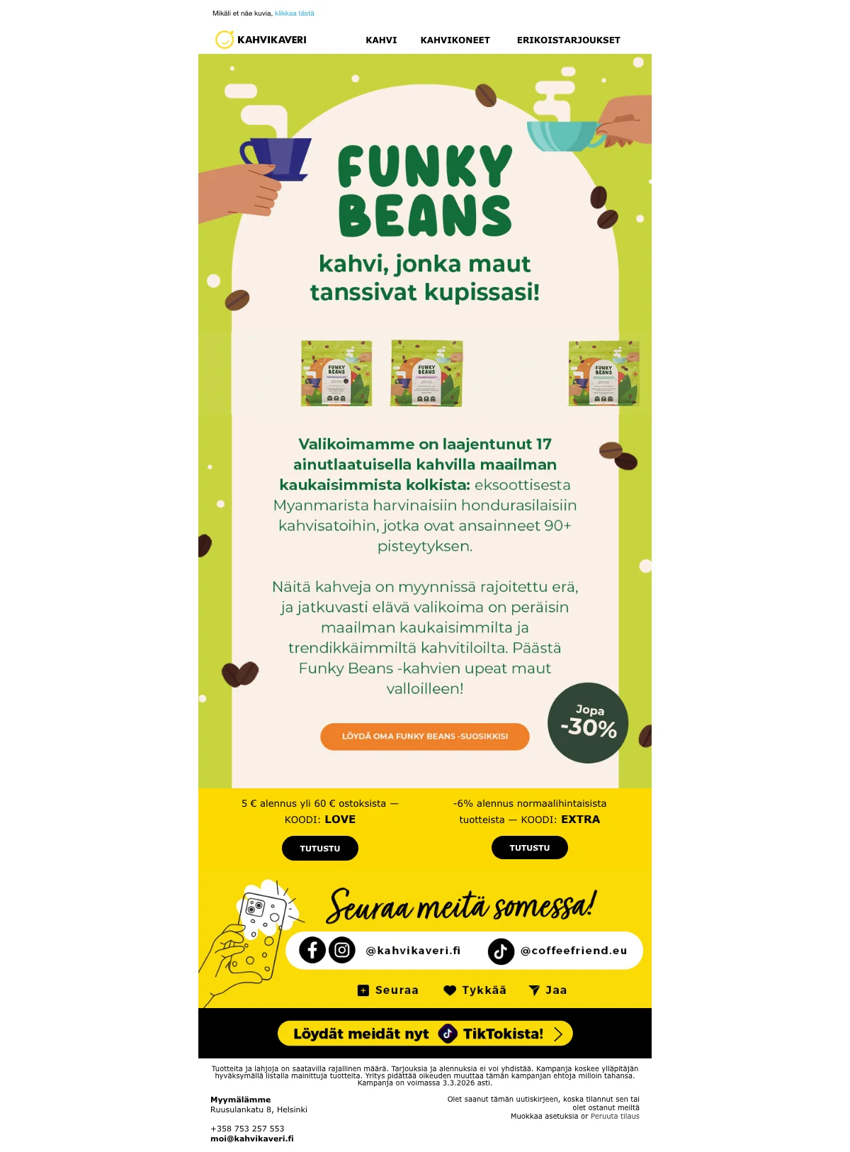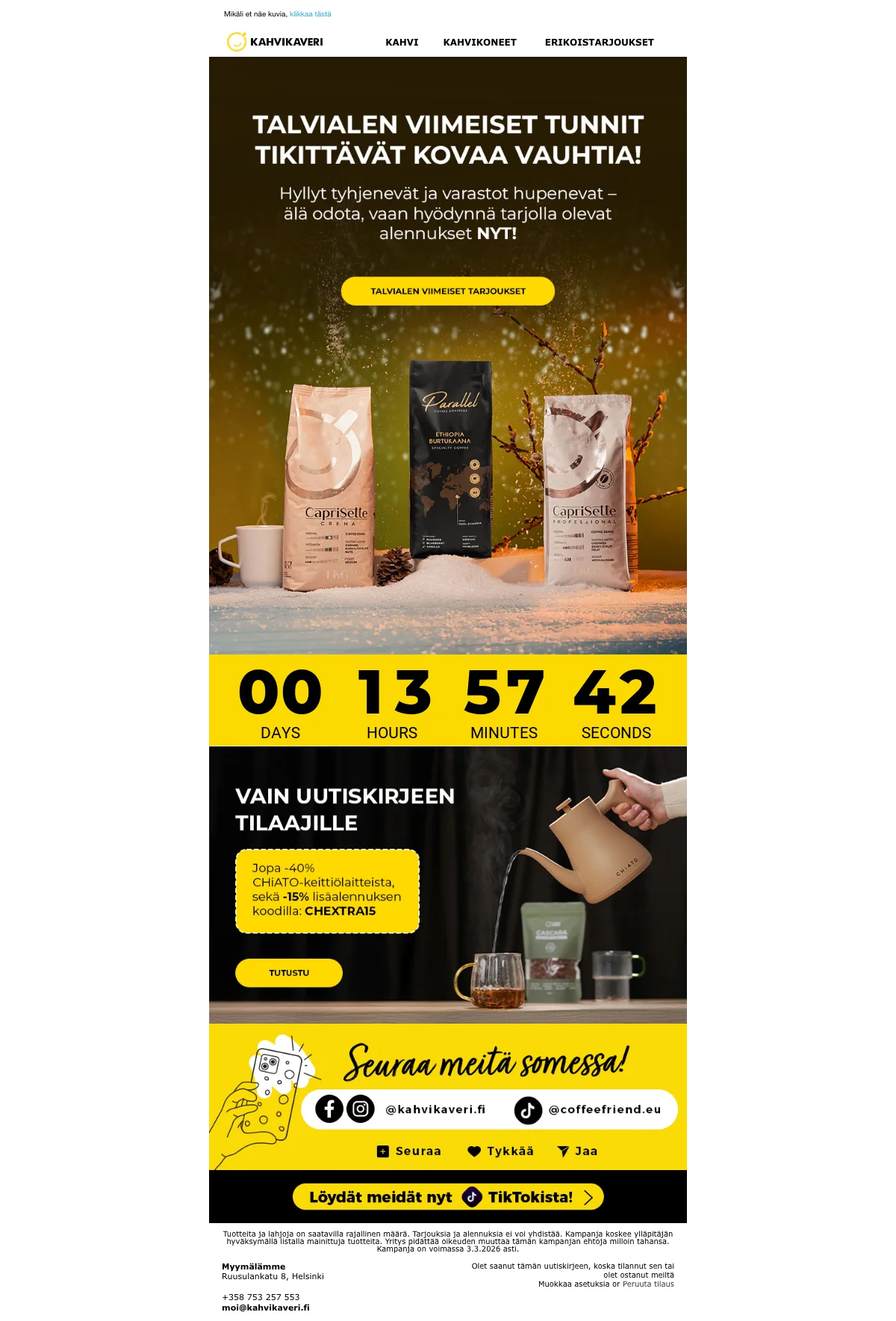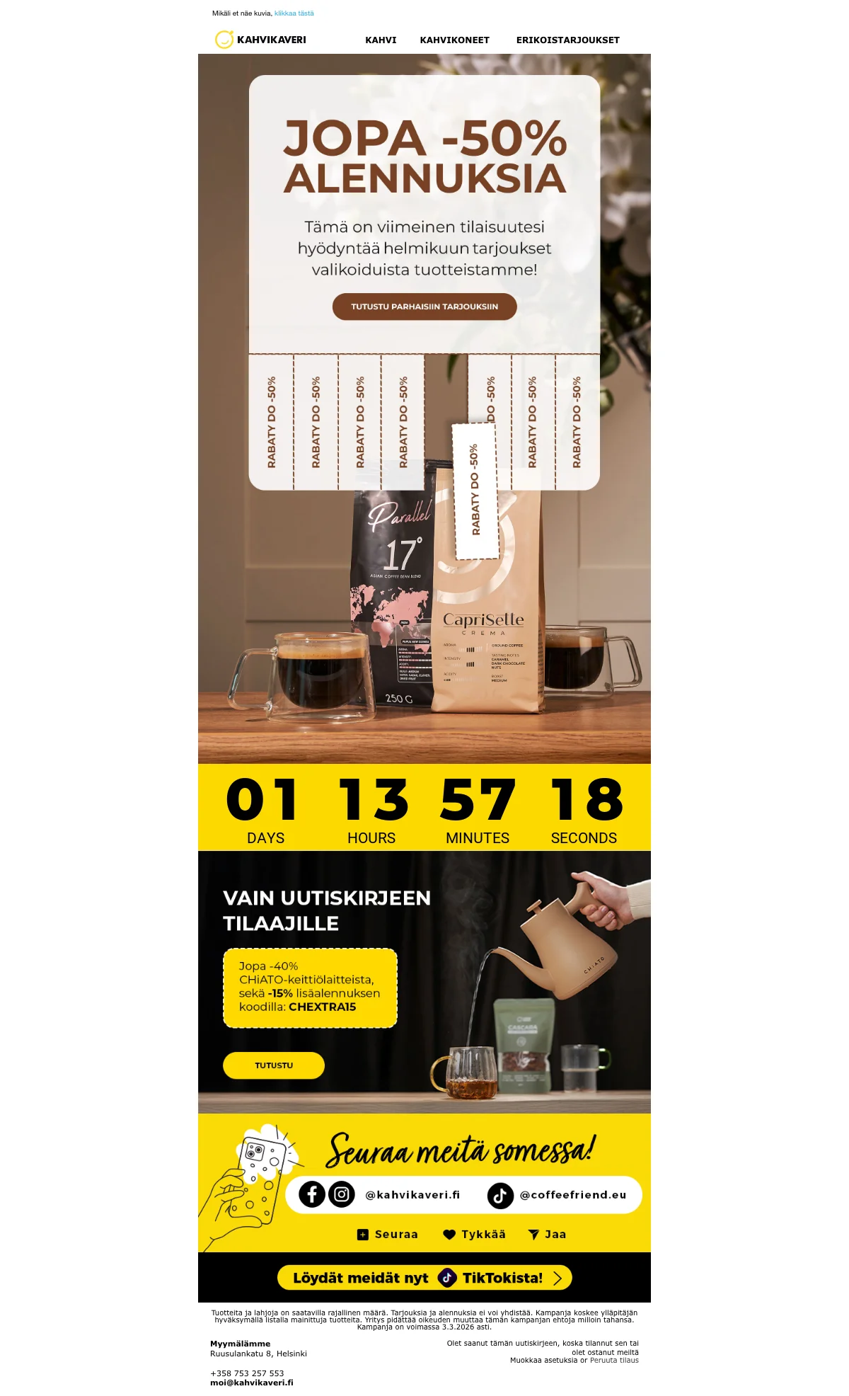 | CFBASKET | Kahvikaveri alennuskoodi: 15€ alennus 500€:n ostoksista |