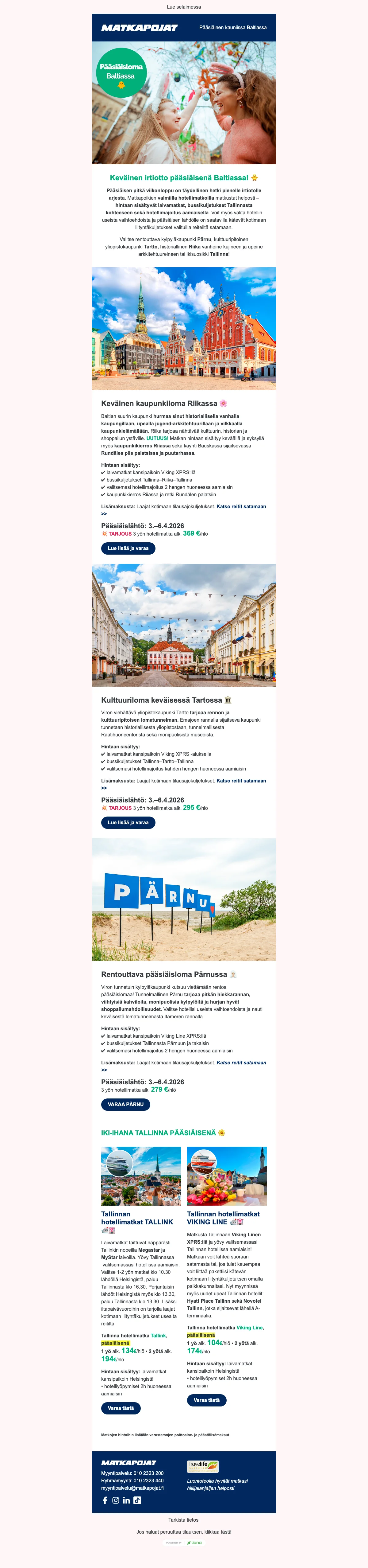 Puriko matkakärpänen? Kaipaatko piristystä kevääseen? Onko viimeisestä lomamatkastasi jo liian pitkä aika? Haaveilitpa sitten kahden viikon kiertomatkasta Euroopassa, elämysristeilystä Karibian kirkkailla vesillä tai pikapyrähdyksestä naapurimaihin, Matkapojat ovat mukana toteuttamassa unelmien lomaasi lähes 40 vuoden kokemuksella matkojen järjestämisestä. Nappaa Matkapojat tarjous ja varaa unelmien loma jopa puoleen hintaan. Halvat matkat toteutuvat helpommin kun tiedät mistä etsiä. Vertaa lennot, valitse parhaat hotellit, ota alle risteily tai varaa talven rantalomat. Kaikki onnistuu helposti ja edullisesti Matkapojat sivuston kautta.