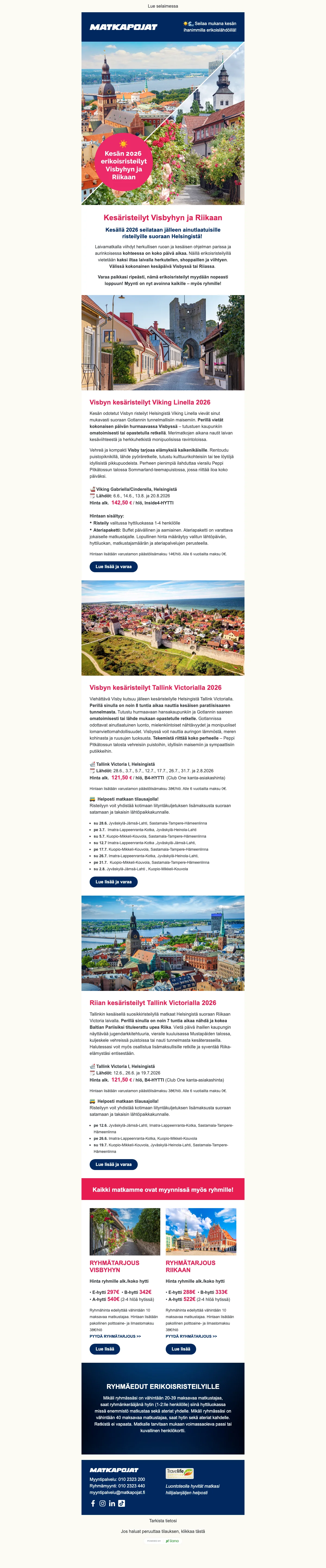 Matkapojat järjestävät risteilyt Tukholman lisäksi Maarianhaminaan, Pietariin ja jopa Uumajaan. Halutessasi kaukomaille tai hieman erilaisiin maisemiin, voit varata risteilyloman vaikkapa Tonavalle tai Karibian upeille saarille. Luonnollisesti suomalaisten suosikkikohde Tallinna on yksi Matkapojat risteilyiden suosituimmista vaihtoehdoista joten jos hakusessa on Matkapojat risteily, valitse Tallinna. Matkapojat risteilyt ovat suosittuja minilomia, joilla viihdyt! Alennuskoodi tai tarjous voi säästää vielä lisää jo ennestään edullisessa risteilyn hinnassa. Matkapojat tarjoukset takaavat sinulle jokainen päivä useita eri vaihtoehtoja laivamatkoille. Monet matkatoimistot eivät ikinä pääse yhtä edullisiin hintoihin kuin Matkapojat ja Ruotsin risteily saattaakin olla juuri se irtiotto arjesta mitä monet kaipaavat. Tarkista risteilyt Helsingistä tai vaikka Turusta ja lähde matkaan kohti laineita ja leppoista tunnelmaa.