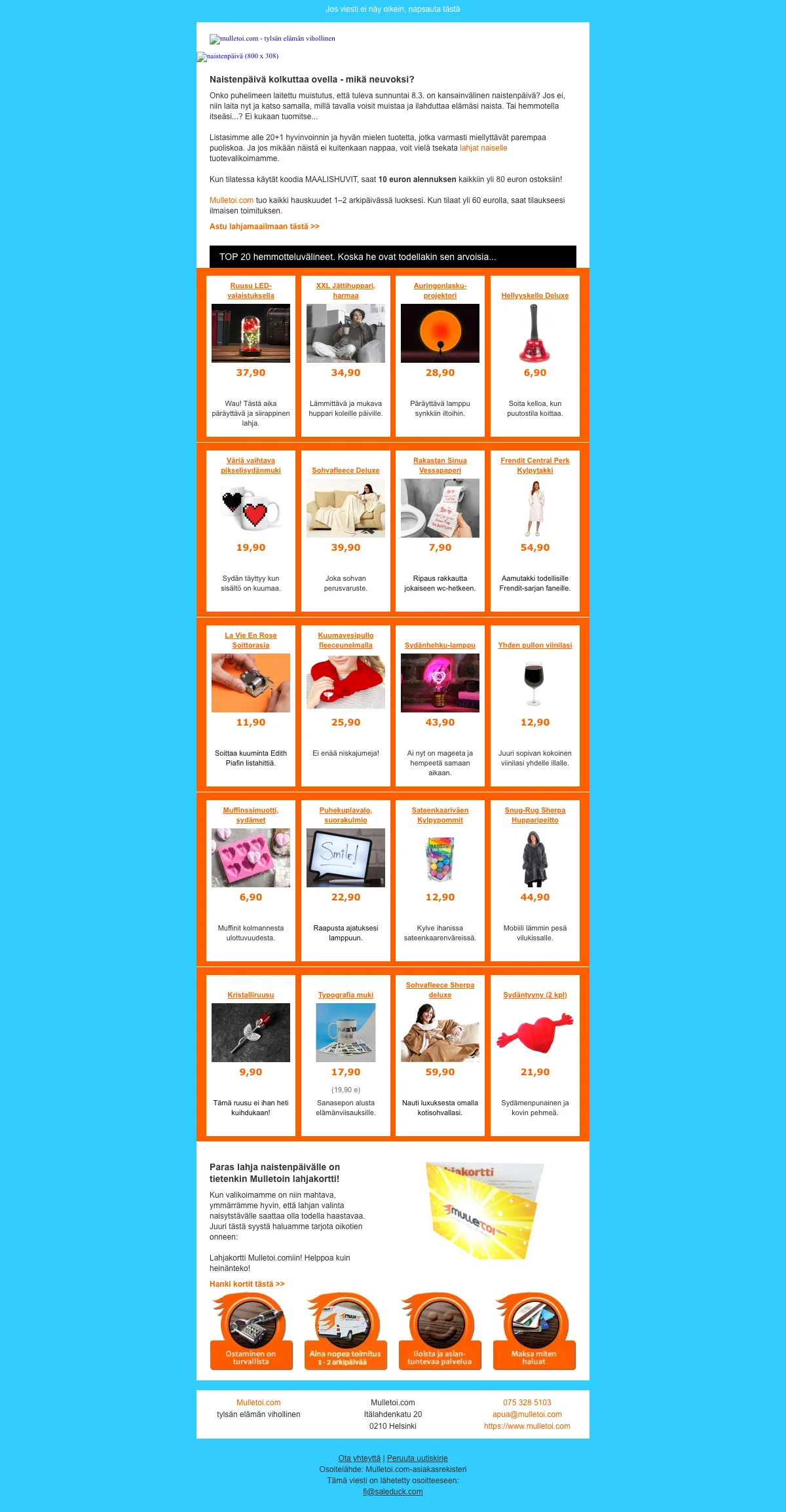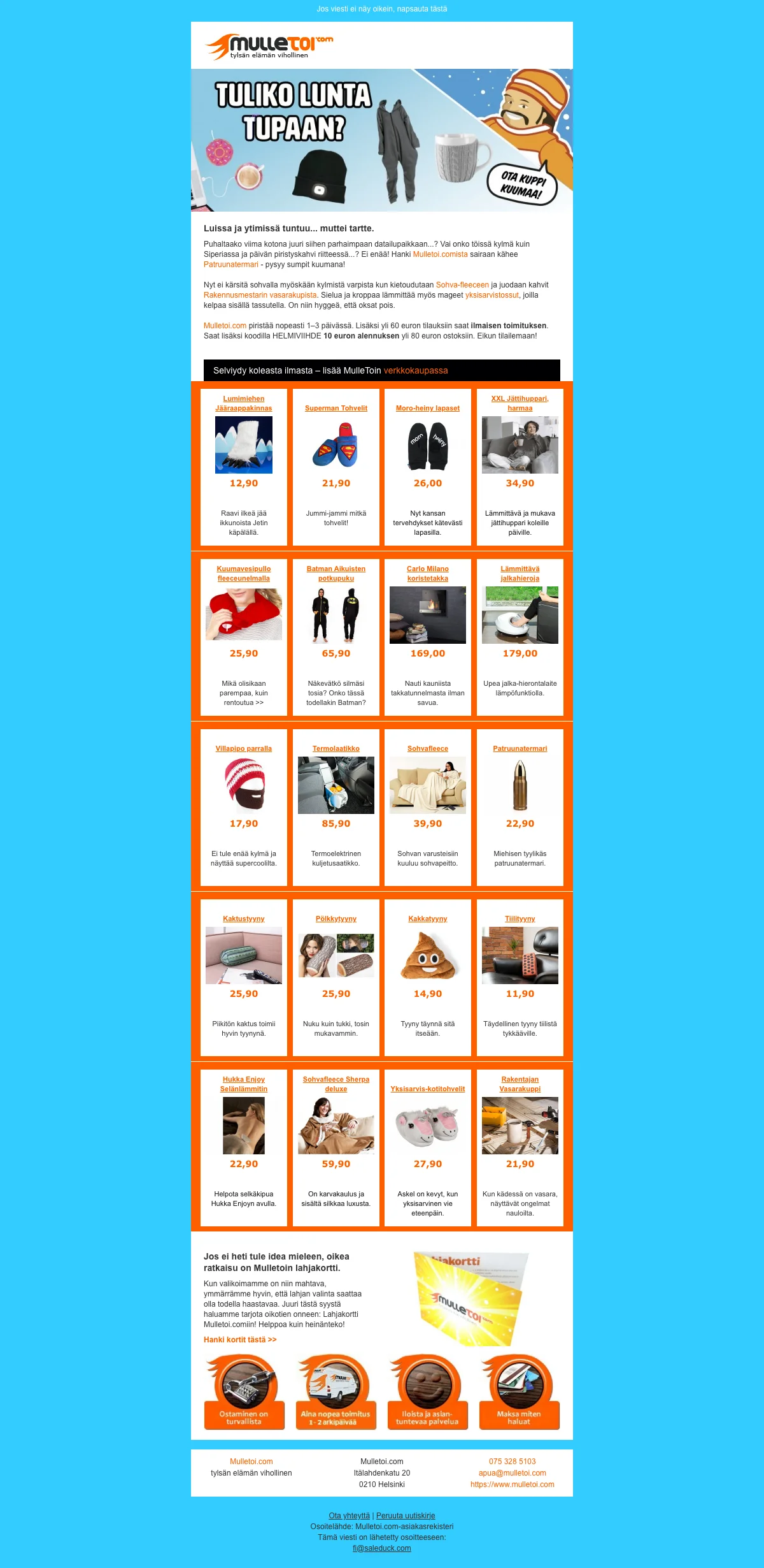 Mulletoi.com on internetissä toimiva verkkokauppa jonka perimmäinen tavoite on olla tylsän elämän pahin vihollinen. Kauppa tuo kaikkien saataville kiitettävän valikoiman erilaisia sisustustuotteita, tekniikkaa, juhlatarvikkeita, naamiaisasuja ,kodintarvikkeita, toimistotarvikkeita sekä seurapelejä. Mulletoi.fi eroaa muista internetin tavarataloista sillä, että kaikki sen tarjoamat tuotteet on varustettu runsaalla ripauksella huumoria ja hauskanpitoa. Jos siis rakastat jekuttaa muita, hassutella juhlissa tai vapaa-ajalla ja pelata hämmentävän hauskoja seurapelejä, tulet rakastamaan verkkokaupan valikoimaa. Poskettomat toimistotarvikkeet piristävät arkeasi myös toimistolla, joten elämäsi voi olla yhtä hymyä "kotoo töihin".