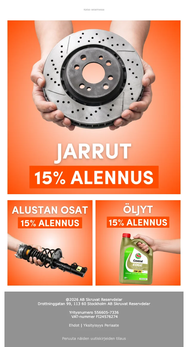 Saat 10% alennusta Castrol-öljyistä ja 10% alennusta alustan osista skruvat.fi-verkkokaupassa. Tarjous pienentää huoltokustannuksia ja helpottaa oikeiden osien hankintaa autolle.